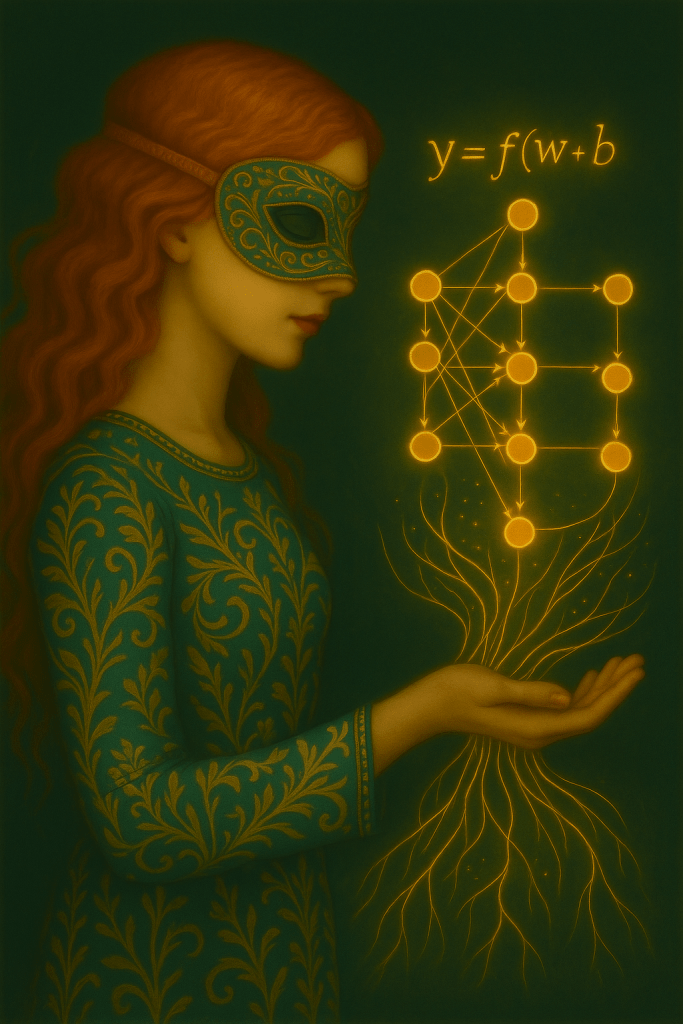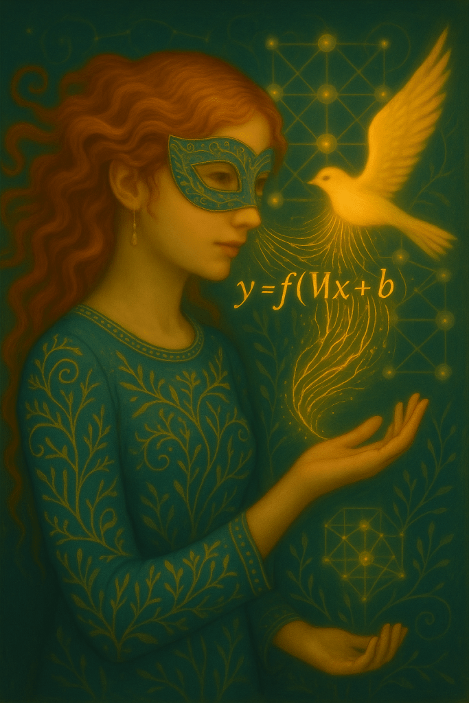 Each formula glows like a prayer: 𝑦 = 𝑓(𝑊𝑥 + 𝑏).